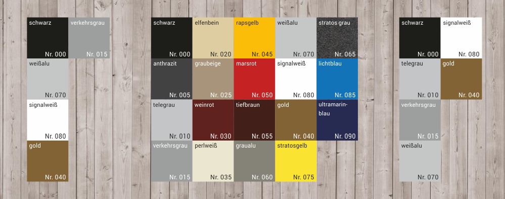 Wählen Sie einmal aus unserem Standartsortiment 30x8 mm, 40x8 mm und 50x8 mm im Profil. Die jeweils erhältlichen Farben entnehmen Sie bitte den einzelnen Farbtabellen.